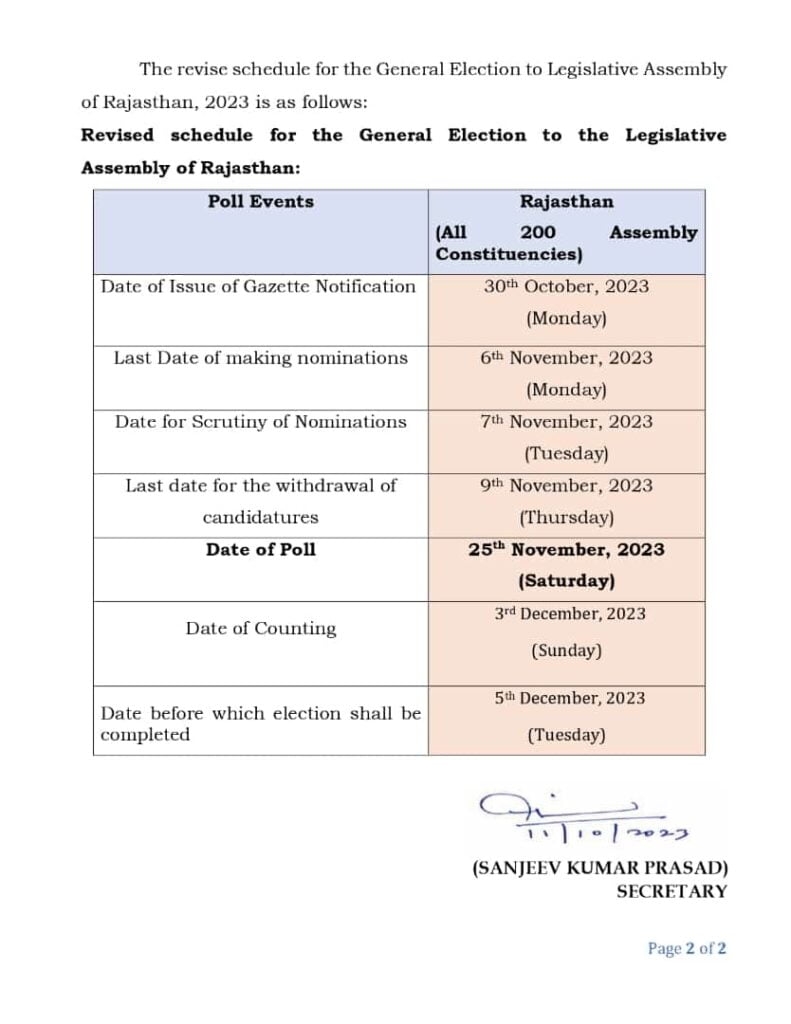 राजस्थान विधानसभा के लिए चुनाव की तारीखें बदल दी गई हैं. राज्य में 23 नवंबर की बजाय अब 25 नवंबर को मतदान होगा. कई राजनीतिक दलों और सामाजिक संगठनों द्वारा उस दिन कई शादियाँ और सामाजिक कार्यक्रम होने के कारण चुनाव की तारीख बदलने की अपील के बाद चुनाव आयोग ने यह निर्णय लिया। इसे ध्यान में रखते हुए, आयोग ने मतदान को शनिवार, 25 नवंबर को पुनर्निर्धारित किया है।